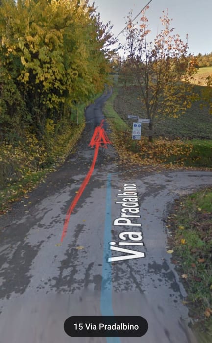 ATTENZIONE: la via cambia nome e diventa via Pradalbino per 1 km e mezzo seguendo la segnaletica “Agriturismo Guardastelle” sino al cancello in ferro battuto dove
